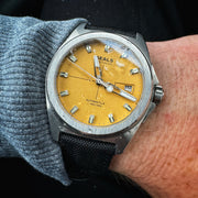 At 38mm, the stainless steel case sits confidently without excess. Satin-brushed surfaces are paired with polished bezel edges and precisely cut lug chamfers, creating a case that feels purposeful rather than ornamental.